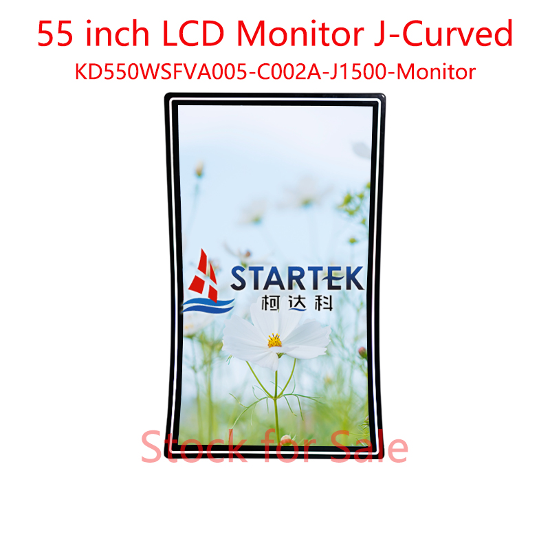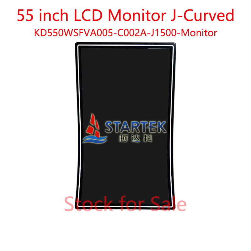 The KD550WSFVA005-C002A-J1500-Monitor is a 55-inch J-curved LCD touch display utilizing amorphous silicon TFT active matrix technology. It integrates a transmissive TFT-LCD panel with a projected capacitive touch screen (G+F+F structure, supporting 10-point multi-touch and compatible with 3M/ELO protocols). The module features an LED backlight unit, multi-interface driver board, and VESA mount, with a curvature radius of R1500.