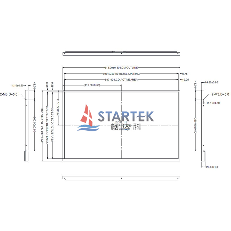 KD270FHFLA022 is a 27-inch TFT-LCM module, adopting amorphous silicon TFT active matrix technology. With UHD resolution (1920×1080) and 16.7M color display, it delivers excellent color reproduction. Equipped with dual LVDS interfaces, the module features an anti-glare surface (3H hardness, 25% haze), 1000:1 typical contrast ratio, 2000cd/m² brightness, and 9ms fast response time, supporting full-view display. Measuring 618×360×20.8mm and weighing 2.8kg, it operates on 12V DC with a minimum power consumption of 3.85W. Passed reliability tests including high/low temperature, ESD, and vibration, the product is suitable for various professional display applications.