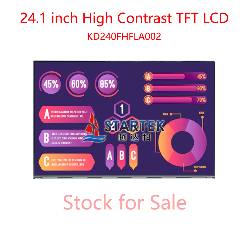 KD240FHFLA002 adopts transmissive TFT active matrix liquid crystal technology, with a resolution of 1920×1200 pixels and support for 16.7M color display. It features an active display area of 518.40(H)×324.00(V)mm, an overall module dimension of 528.20×342.60×12.50mm, and a weight ranging from 2450g to 2600g. The interface type is LVDS. The typical supply voltage is 10V, with an operating temperature range of 0~+50℃ and a storage temperature range of -20~+60℃. The backlight consists of 64 LEDs arranged in a 4-series and 16-parallel configuration, boasting a typical brightness of 600cd/m², a contrast ratio of 1000:1, and an LED service life of up to 50000 hours.